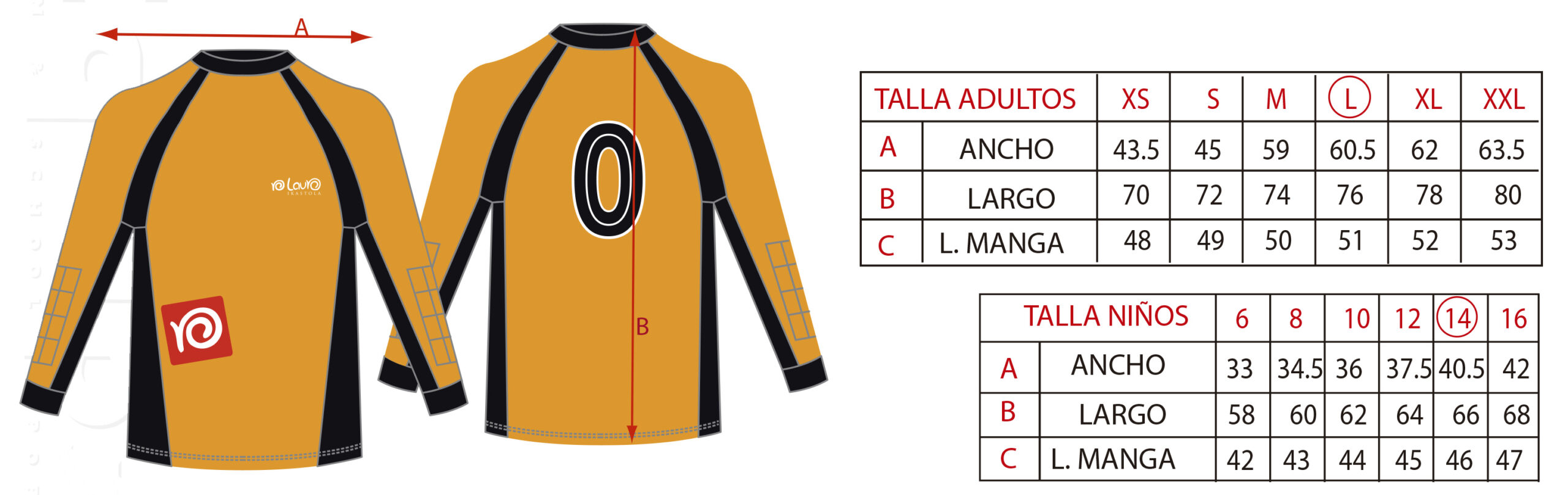 Camiseta de portero de micropiqué transferizado. Manga larga con puño de canalé negro y protecciones. Cuello redondo de canalé negro.
