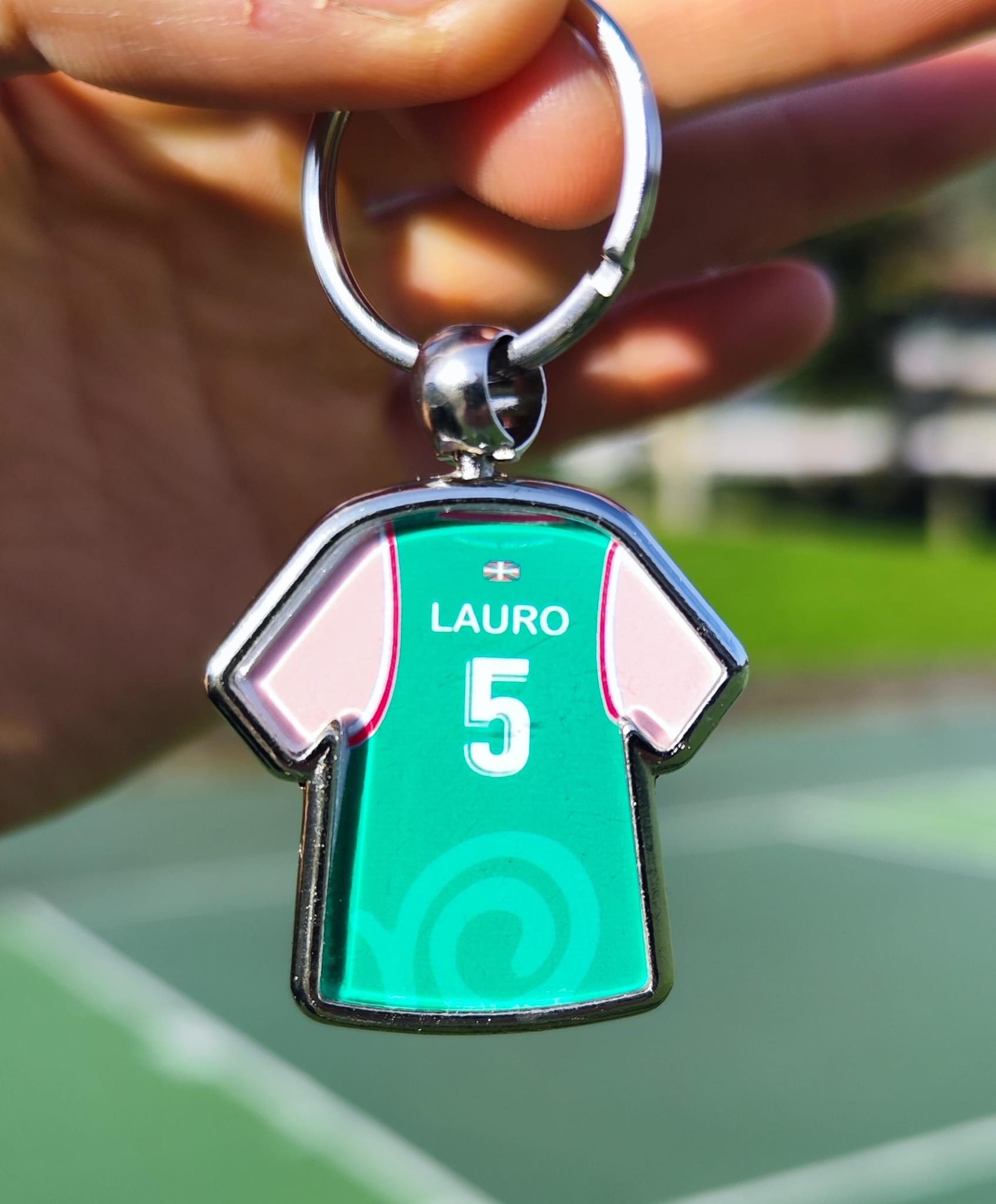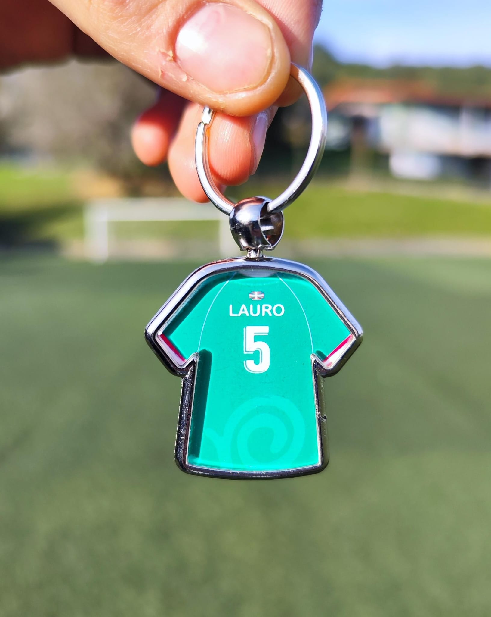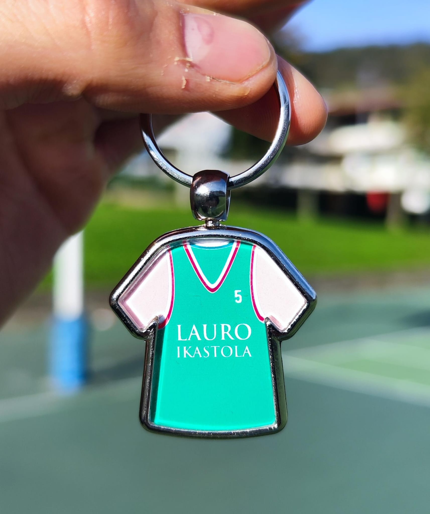 Llavero personalizado con la nueva equipación de saski/fútbol de Lauro Ikastola y el número y nombre del jugador/a.